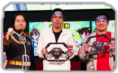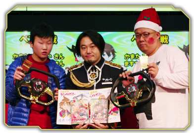 ペアはシングルとはまた違った楽しみがあって、 それがジャイロゼッターの特徴でもある。その頂上決戦となった。 優勝したかまたさん&ますたにさんペアは昨年のアルカディアGPでも九州・沖縄地区代表として決勝大会に進出したが残念ながら準決勝で敗退していた。今年は1年間の沈黙を破り見事リベンジを果たした結果となった。素晴らしい絆パワーだった! 注:ますたにさんは本物のくまもんではありません。 準優勝のまえじまさん&いでさんペアもお揃いのハチマキをして見事なコンビネーションで戦い抜いてくれた!表彰式のときに思わず「汗臭い!」って言っちゃったけど、それくらい熱い戦いだったのだろう。グッドスメルだったぞ! かまたさん&ますたにさんペア まえじまさん&いでさんペア おめでとう!! すべての対戦は動画で記録してある。動画の公開は年明けになってしまうがジャイロゼッター最後の激闘を是非見てもらいたい!そこには様々なドラマがあるぞ! 最後にアルカディアGPに参加してくれた全国のドライバー諸君に感謝する! ジャイロゼッターを愛してくれてありがとう!