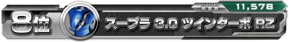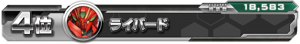 中間結果のライバードを抜いてなんと3位に!!確かに合体インプレッサは強いから そのためのランクインだろう。カッコいいとか強いとか分かりやすいマシンが人気だな!しかし新1弾から新たな合体マシンも登場するからこの座が不動というわけにはいかないだろう(ニヤリ)。